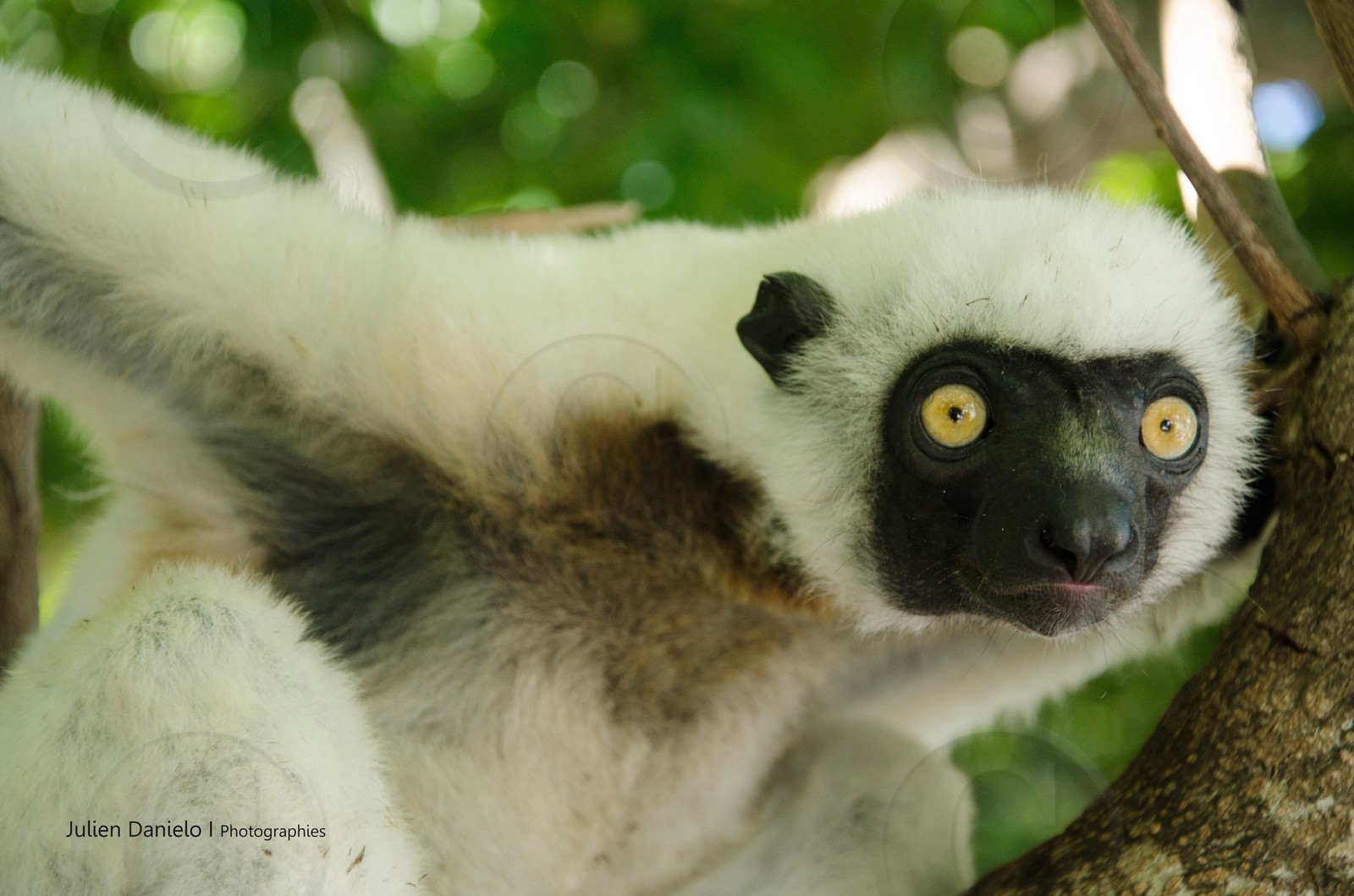 Description | Sifaka de Von der Decken sur l'île de Nosy Antsoha - A mi-parcours entre Nosy-Be et Nosy Iranja se trouve cette petite île transformée en réserve de lémuriens. Les bateaux de touristes y débarquent de temps en temps et certains gardiens proposent des mangues aux animaux qui viennent se servir sans crainte. Grand lémurien diurne il est endémique de Madagascar. Bien qu'essentiellement arboricole, certains ont développé un déplacement bipède sur le sol qui leur vaut parfois le surnom de lémurien danseur. Le Sifaka a inspiré de nombreuses légendes malgaches et est un des meilleurs ambassadeurs de la diversité écologique de Madagascar. |